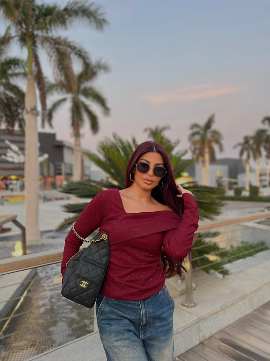 Off-Shoulder Shimmer Top 2 Burgandy