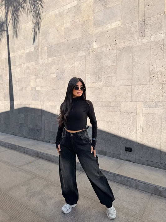 Baggy Jeans with Double Button & X Tie 2B Black