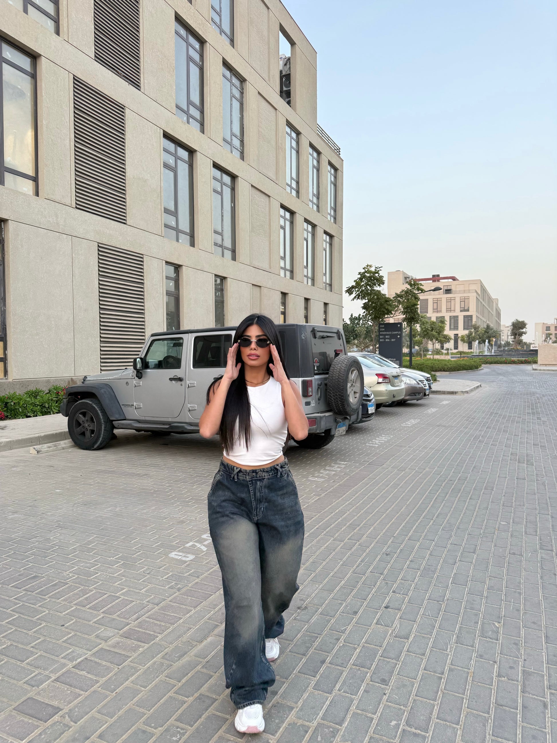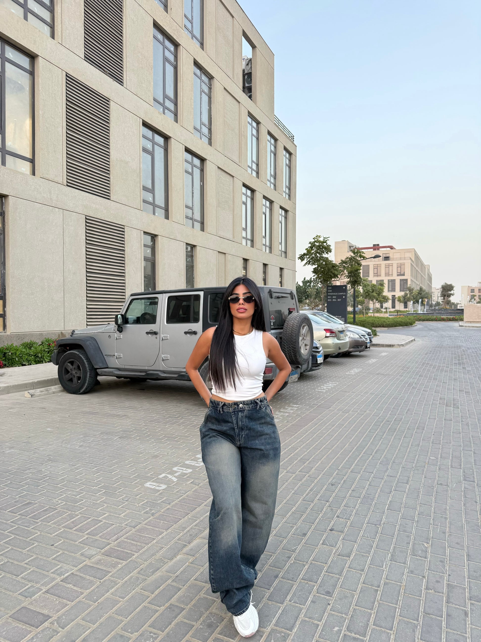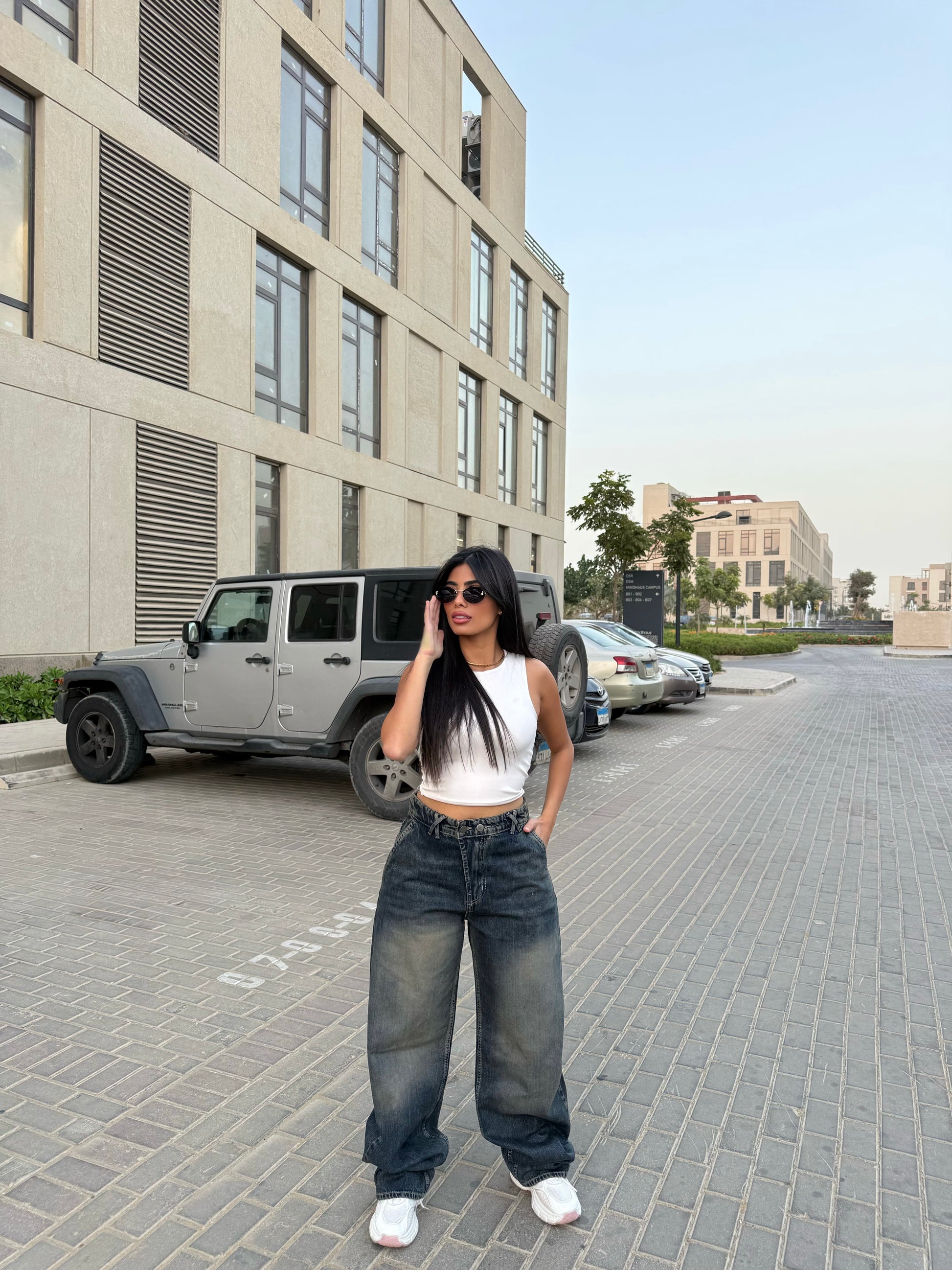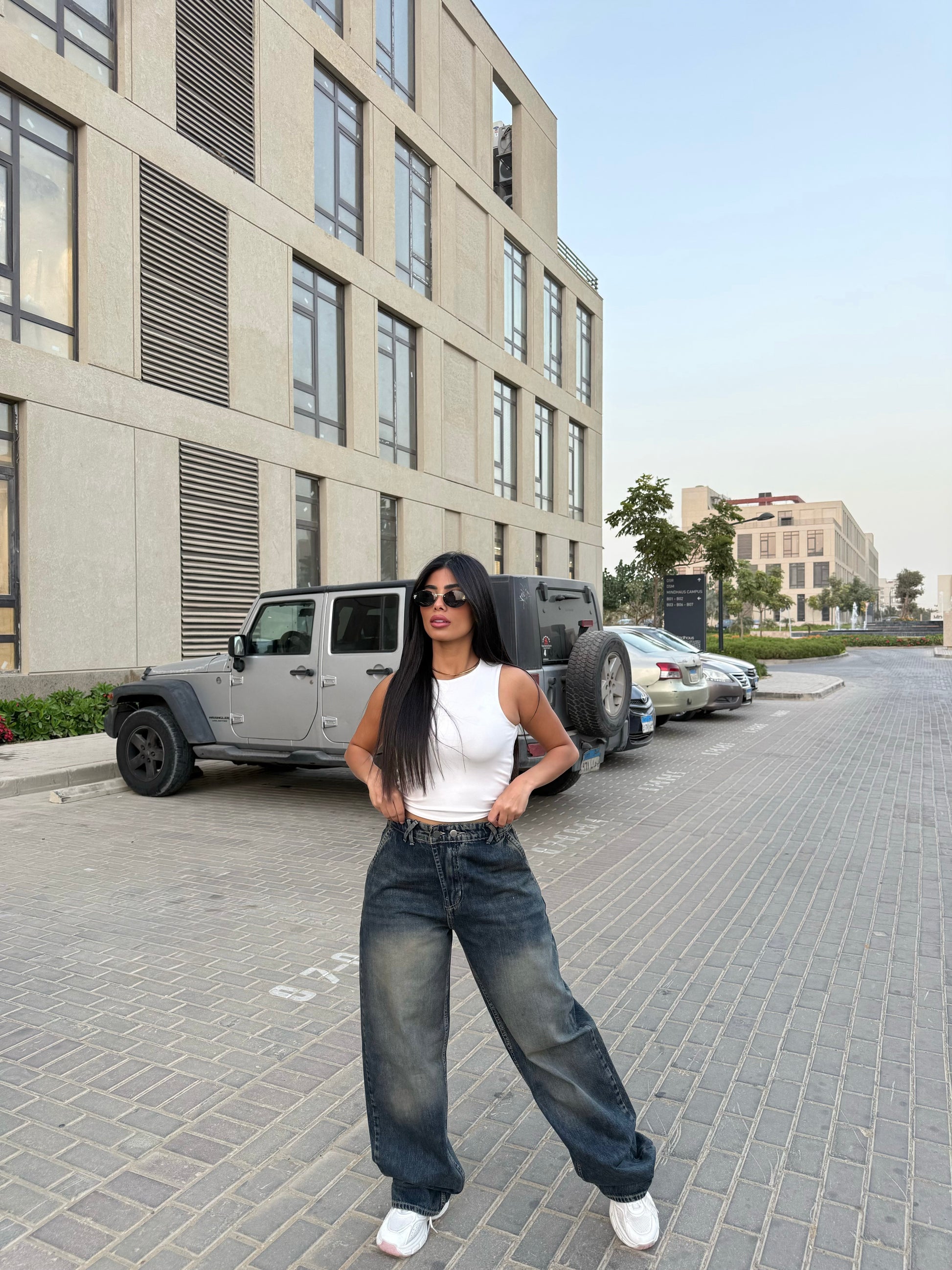 Baggy wide leg jeans featuring a unique X-tie waist design with double buttons for a secure adjustable fit.